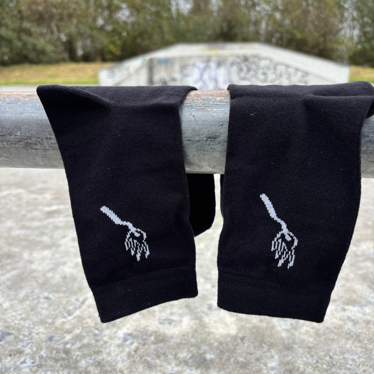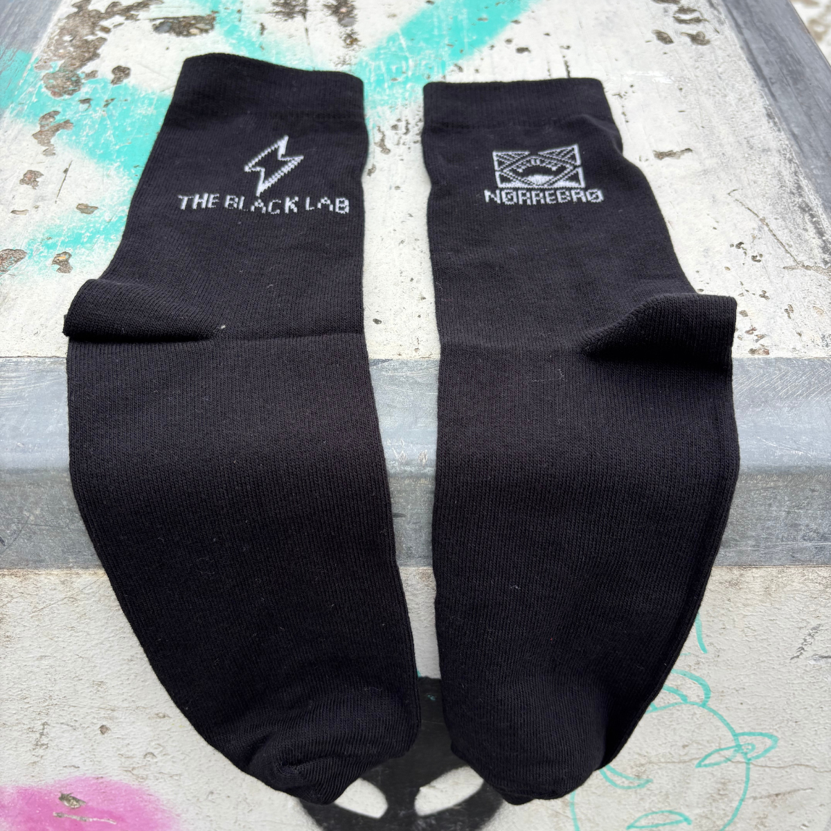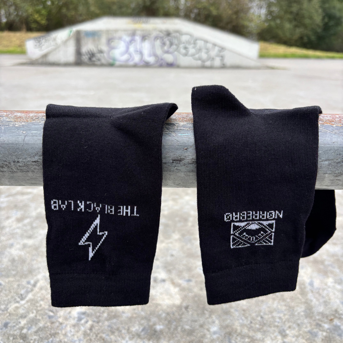 Les chaussettes The Black Lab x Nørrebro Riding Club, au design signé Néant, combinent maintien, respirabilité et look minimaliste.